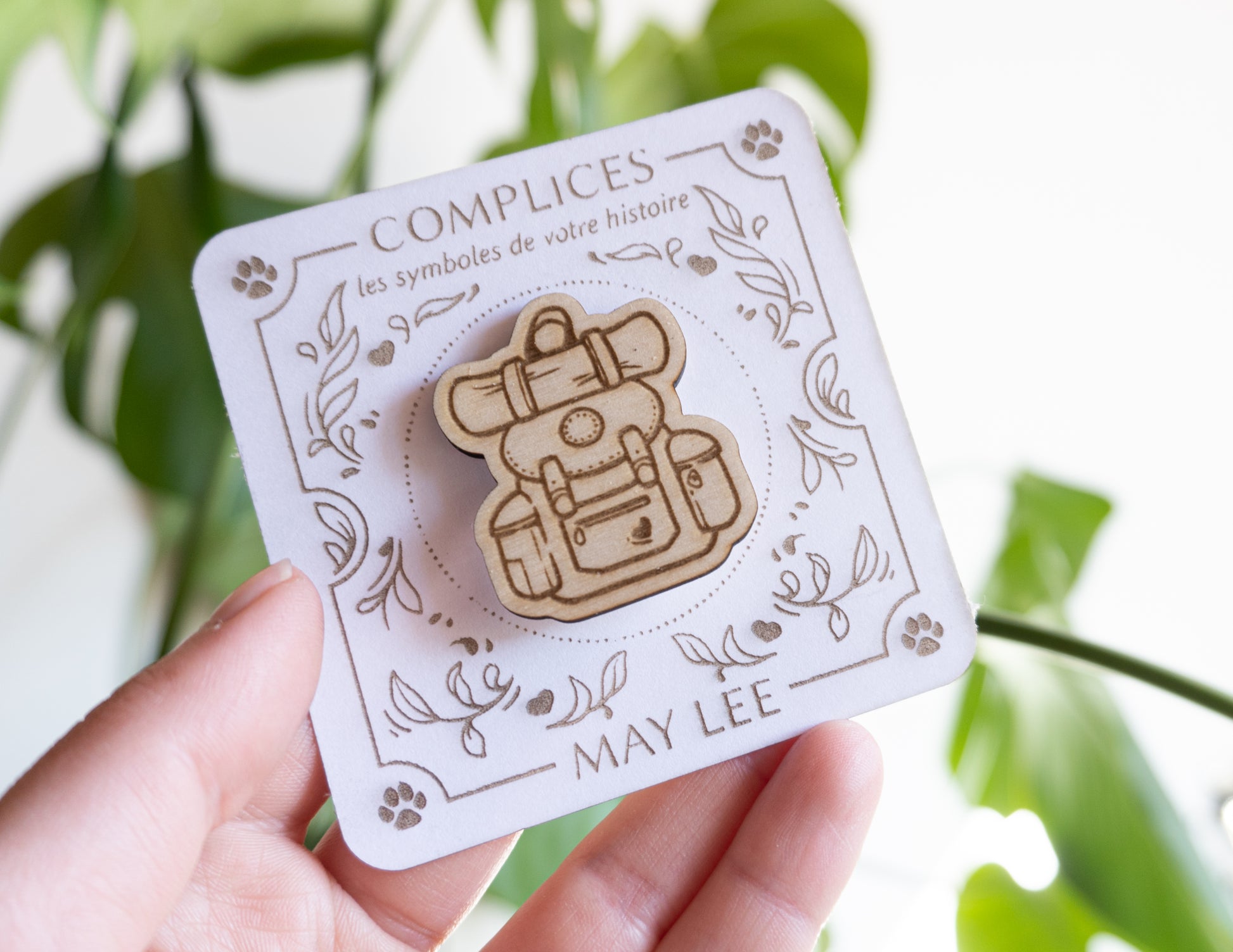 Ce pin's en bois gravé représente un sac à dos de randonnée, prêt pour toutes les aventures à deux pattes et quatre pattes.